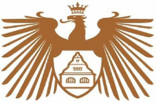 The mark consists of a stylized eagle with a tongue sticking out, outspread wings and a crown on its head. In the center of the eagle is a shield featuring a building with a gable front and triangle shaped roof, all in copper.