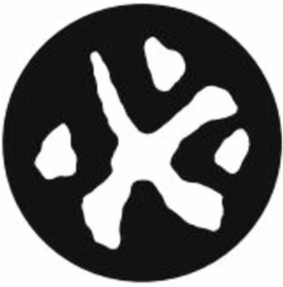 The mark consists of a shaded circle featuring three smaller stylized circles with irregular circumferences surrounding a stylized letter "X".