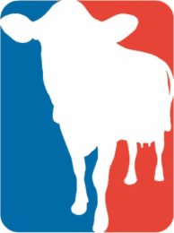 The mark consists of a design of a cow silhouette in white inside of a rectangle with the left half in blue and the right half in red.