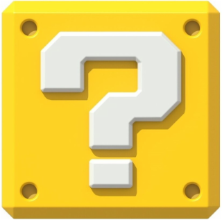 The mark consists of a yellow square with slightly rounded corners and beveled edges. In the center of the yellow square is a large white question mark with gray shadowing to give the appearance of depth. Each of the four corners of the square has a circular indentation with yellow and grey shadowing to give a recessed appearance.