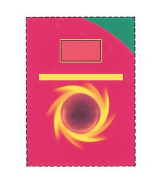 The mark consists of a red background with the upper right corner in green, a solid rectangle with two distinguishable borders in the upper center, a yellow rectangular bar running horizontally across the middle center, and a yellow vortex design in the lower center with gradient shading that increases from light to dark orange from the inside ring of the vortex design to the center of the vortex design. The broken lines indicate the position of the mark on the packaging and do not form part of the mark. The shape of the packaging is not claimed as a feature of the mark.