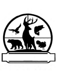 The mark consists of a firearms scope lens in which a deer is center mass with four wildlife animals in each corner of the scope lens, namely a bear in the lower left, a duck in the upper left, a fish in the upper right, and a turkey in the lower right; with a rectangle banner below.