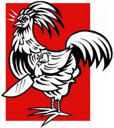 The mark consists of a design of a white rooster outlined in black, holding a black-outlined knife and with a black outlined heart-shaped tattoo on its wing. The entire rooster is on top of a red rectangle.