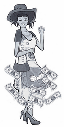 The mark consists of a stylized rendering of a lady wearing a wide-brimmed hat, a pearl necklace, a short-sleeve dress featuring print and her image resembling a one dollar bill and closed toed pump shoes while holding a small handbag on her right arm and a debit card featuring the lady's torso in her left hand all superimposed behind eight stylized one dollar bills featuring the lady's face and shoulders in the center.