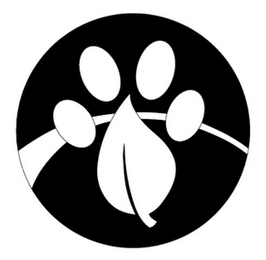 The mark consists of a leaf and paw print design within a circle, with the metacarpal pad in the paw print in the shape of a leaf with the four digital pads in the paw print, with the leaf and paw print design appearing against a circle and against a stripe within the circle which begins on the lower left side of the circle and curves up to a point slightly above the middle of the circle and down to the right side of the circle, tapering from a broader stripe on the left to a narrower stripe on the right.