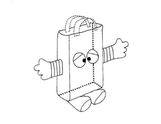 The mark consists of a three-dimensional configuration of a tote bag in the shape of a fanciful creature with a rectangular body, legs, eyes and arms with four vertical stripes as features of the mark. The dotted lines provide a three-dimensional perspective, while the broken lines indicate the presence of a handle, but neither the broken lines nor the dotted lines are part of the mark.