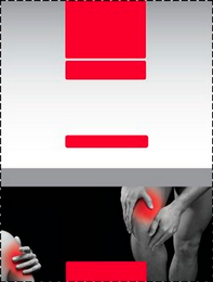 The mark consists of a vertical rectangular package configuration; the rectangle is divided horizontally into thirds. The top third appears in gray with two red banners of different lengths centered. The center third is primarily white with a small red banner centered and a narrow dark gray rectangle at the bottom of this section. The lower third of the rectangle appears in black with a narrow red banner centered at the bottom and with the configurations of a person's right shoulder and left hand in the lower left corner and the configuration of a person's legs and hands on the right knee. Patches of skin highlighted in red appear on the shoulder and on the knee.