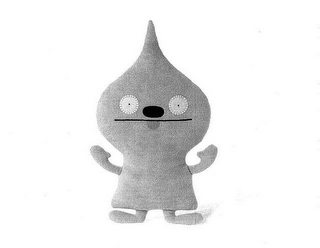 The mark consists of a three-dimensional configuration of a figure with a circular head and a pointy top and loosely formed body, circular hand-stitched eyes with a dot in the center, oval-shaped nose, a mouth formed by a straight line across most of the face and one curved tooth hanging down from the mouth, short arms and short legs, which is neither human nor animal.