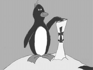 The mark consists of a penguin standing to the left of a rolled scroll bearing the image of a cross with the penguin holding the top of the scroll.