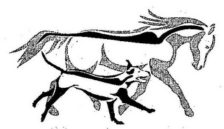 The mark consists of a dog running along side of a running horse.
