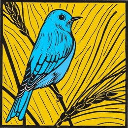 The mark consists of A blue bird with black and white details perched on a black wheat stalk against a yellow-brown square background with a black border.