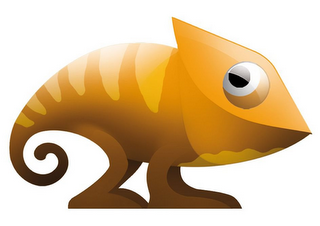 The mark consists of a fanciful characterization of a cameleon with black, gray, white, and brown eyes; a head of graduated shades of orange with yellow in the neck and chest area; a body of graduated shades of orange and brown with graduated shades of yellow stripes over the back; and legs, feet, and tail of graduated shades of brown.
