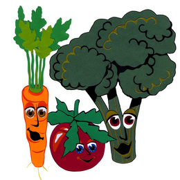 The mark consists of three cartoon vegetables consisting of an orange carrot with a green top having brown, black and white eyes and a black mouth, a red tomato with a green top and blue, black and white eyes and a black mouth and a green broccoli with maroon, black and white eyes and a black mouth.