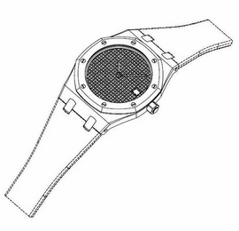 The mark consists of a three-dimensional configuration design of a watch: the watch face is round and surrounded by an octagonal-shaped unitary bezel which features eight hexagonal-shaped screw heads positioned parallel to the curve of the bezel at each corner of the octagon; the watch case is a unitary piece below the bezel and extending beyond the four corner sides (i.e., NE, SE, SW and NW) of the bezel; at the north and south ends of the bezel, the width of the case narrows slightly and slopes downwardly at both ends, giving the appearance of a plate extending across the width of the case and including two indentations on each end into which are inserted attachment studs which connect the case to a strap or bracelet; the attachment studs are rectangular with rounded ends; the watch face is adorned with a Grande Tapisserie decorative pattern constituted by regularly spaced raised points covering the entire face; the winding crown is a faceted hexagon. The dotted outline of a watchband, the watch hands, and the date window, are not part of the mark but are merely intended to indicate the position of the mark.