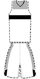 The mark consists of a basketball uniform design with horizontal stripes across the upper portion of the jersey and shoulder straps and neckline of the jersey and vertical stripes down the side of the shorts with a star on the side bottom of each short leg. The broken lines around the edge of the uniform are not part of the mark and are only to show the position of the mark on the goods.