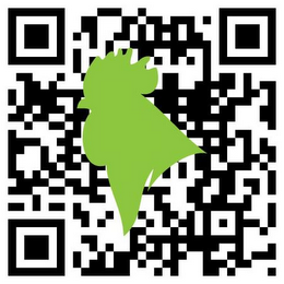 The mark consists of a black and white quick response code design consisting of a white background with black marks and a yellow/green rooster head silhouette in the middle of the code.