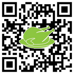 The mark consists of a black and white quick response code design consisting of a white background with black marks and a yellow/green whole chicken on a plate on the middle of the code.