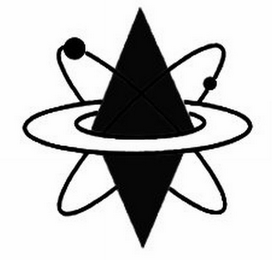 The mark consists of two horizontal concentric circles, two triangles in solid shade sharing a horizontal base, and two ellipses juxtaposed at 45 degrees from the concentric circles, wherein the two triangles point upward and downward, respectively, the inner circle surrounds the horizontal base of the two triangles, and each of the two ellipses includes a small dot, one dot larger than the other, both reminiscent of an atomic particle traveling in an oval orbit.