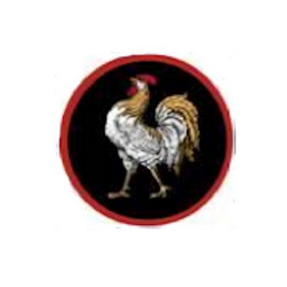 The mark consists of black circle outlined in red, containing the stylized design of a chicken depicted in the colors red, brown, white and grey.