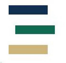The mark consists of a blue parallelogram above a green parallelogram above a tan parallelogram, all of which are horizontally aligned with the middle green parallelogram protruding to the right of the others. The color white represents background and is not a feature of the mark.