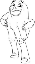 The mark consists of a smiling face of a person who has a body that includes muscular male arms and legs that look similar to human fingers.