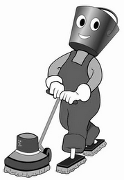 The mark consists of a design of a man in overalls and gloves with a smiling bucket as a head, mops as feet and pushing a floor polisher.
