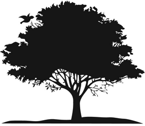 The mark consists of a tree on non-level ground with a small bird flying above the left side of the top of the tree.