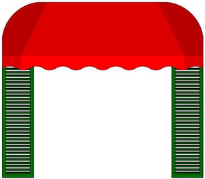 The mark consists of a red and dark red awning with rounded corners at the top sides and a scalloped edge with gold trim above green shutters at each side of the awning.