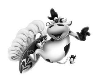 The mark consists of a cartoon cow surfing on a surfboard with a stylized wave extending upward from the surfboard.