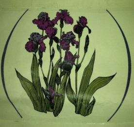 The mark consists of flowers (namely, Iris) featured with green leaves and purple and gray flowers; the flowers are enclosed by two gray semicircles on either side of the image; the background color is not claimed as a feature of the mark.