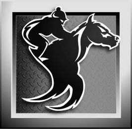 The mark consists of A rectangle inside of which is an image of a horse's head and front legs, a jockey is depicted riding the horse.