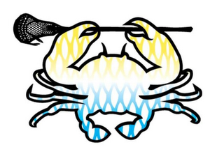 The mark consists of a crab holding a black lacrosse stick with a black and white net, the body of the crab is white with a black outline and filled with a mesh pattern which fades from yellow at the top to blue at the bottom.