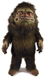 The mark consists of a hairy character with brown fur, a green oversized face, a brown and red nose with green mucus dripping down from the nose, red eyelids, green and ivory eyes, green and red lips, ivory teeth, and tan and green hands and feet.