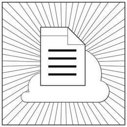 The mark consists of a piece of paper with four horizontal lines in the center, one horizontal line at the top, with the upper right corner folded down, in a cloud surrounded by a sunburst, all within a square.