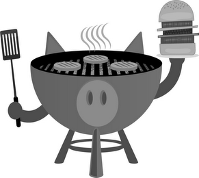 The mark consists of a grill with pig-like features holding a burger sandwich in one hand and a BBQ tool in the other. The grill is open and depicts three burgers on the surface with smoke emanating upward.