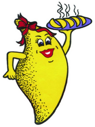 The mark consists of a caricature of a female chef with a body shaped like an empanada; she is carrying a plate of empanadas. The chef has a yellow body outlined in black with black speckles/dots on it. The chef's eyes are white, blue and black; her eyebrows and lines surrounding her mouth are black; her mouth/lips are red, white and black. The chef has a red bow outlined in black at the top of her body/head. The tray is blue outlined in black. The empanadas are yellow outlined in black and the steam emanating up from the empanadas is black.