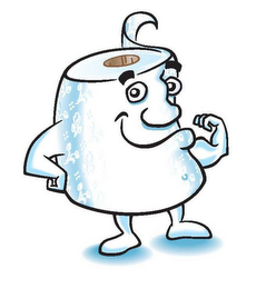 The mark consists of a black outline of a roll of toilet paper with human-like qualities, specifically, face, arms, and legs. It is shaded with blue near the edges, specifically around the feet, legs, arms, facial features, top of paper roll, and sides of paper roll. The blue edges on the sides and back of the torso contain white and blue stylized flowers and white dot geometric design. The center of the roll is shaded brown.
