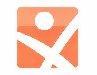 The mark consists of a polyangle design that is orange with a lighter upper portion and a superimposed human form comprised of a white dot as a head and a white X forming stick-like arms and legs.