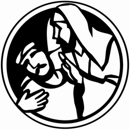 The mark consists of a circular design depicting two men, one bearded man wearing a head scarf and robe with one arm wrapped around the other moustached man wearing a turban, and the other arm held up, hand facing out with fingers pointed up, giving the appearance of the bearded man who is wearing a scarf and robe comforting the moustached man wearing a turban.