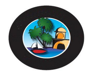 The mark consists of a seascape scene comprised of blue sky and ocean, green palm trees, with black trunks, a red sailboat with white sails and black outlining, and an orange building with black outline and shading surrounded by a white circular outline and a black circular ring.