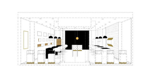 The mark consists of the design and layout of a retail store. The store features a clear glass storefront with narrow rectangular horizontal panels over the top and bottom of the left and right sides of the glass front, and a thicker center panel stacked on top of the central glass doorway. The central glass doorway is recessed from the left and right sides of the glass storefront. Within the store, circular recessed lighting units traverse the length of the store's ceiling. Domed lighting units in black color traverse the length of the store's ceiling, equally placed at the front left and right sides of the store immediately visible through the clear glass storefront. Display pedestals are equally placed at the front left and right sides of the store immediately visible through the clear glass storefront. The display pedestals consist of a gold color base, white color mid-section and clear acrylic riser. The front right side wall consists of a glass panel followed by a white color modular art panel, with a gold and white color in-wall product display installed at the center of the white color modular art panel. The rear right side wall consists of stacked white color wall panels, each containing a rectangular cut out with puck lighting. The front left side wall in white color contains a pre-fabricated graphic lightbox with gold bordering. The middle left side wall in white color contains three rows of equally spaced wall panels and niches, the top row consisting of pre-fabricated graphic lightboxes, the middle row consisting of short rectangular niches with gold color interiors, and the bottom row consisting of longer rectangular niches with gold color interiors. The rear store wall consists of a black color tempered glass center panel surrounded by white color wall panels to the left and right. Immediately in front of the black color tempered glass panel is a cashwrap consisting of a white color modular art panel stacked on top of a gold color base. Immediately above the cashwrap is a hanging textured globe pendant light in gold color. To the left of the black tempered glass center panel is a doorway covered by a gold color textured curtain providing entrance to a store VIP area. There are demonstration tables arranged in a line along both the left and right side walls immediately visible through the clear glass storefront, each table containing one side panel and countertop in black color and the rest of the table panels in white color. One side of each demonstration table also includes two white carved legs. The walls, floors, lighting, and other fixtures appearing in dotted lines are not claimed as individual features of the mark; however, the colors and overall placement of the various items as specified herein are considered to be part of the overall mark.