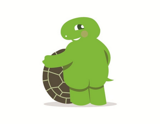 The mark consists of turtle in green with a dark green and white eye, tan cheek, white nose, white mouth, and dark green contouring, facing backward holding brown and tan shell. The shadow below the turtle and shell appears in gray.