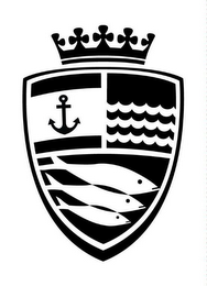The mark consists of a shield topped with a crown with three parts to the shield; the top left consisting of an anchor, the top right consisting of three wavy lines representative of water, and the bottom portion consisting of an image of three fish.