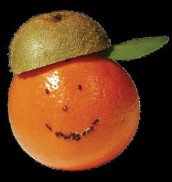 The mark consists of Figure composed of a whole orange citrus fruit with eyes, nose and smile formed with kiwi fruit seeds, wearing a cap made from half a kiwi and with the bill of the cap a leaf from the citrus fruit.