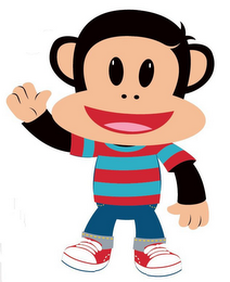 The mark consists of a full-bodied beige wide mouth smiling monkey with a black outline around the head and ears, black eyes, a black nose, a red mouth with a pink tongue, wearing a turquoise and red striped shirt, blue pants and red and white tennis shoes.