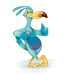 The mark consists of an Amazon bird with one thumb up holding a cell phone. The Amazon bird is turquoise with blue feathers on its wings and turquoise, blue, purple and dark purple feathers on its body. The Amazon bird's beak is yellow, outlined in brown with a brown, dark orange and light orange tip with white shadowing. The Amazon bird's eyes are white, outlined in gray with black pupils with a white circle in the pupil. The Amazon bird's feet are yellow with orange stripes. The cell phone is gray, outlined in black, with a green button in the center. There is a turquoise shadow below the Amazon bird.