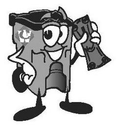 The mark consists of a stylized trashcan with facial features and arms and legs holding money.