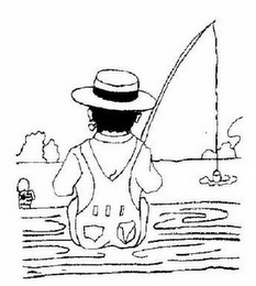 The mark consists of a man, wearing a hat, shirts and overalls, sitting on a wharf and fishing while facing trees across the water.