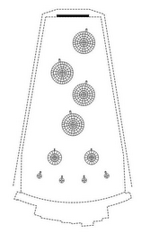 The mark consists of a three-dimensional configuration of the layout of a golf driving range featuring ten circular targets in three sizes, the smallest four in a row in the front, with the two medium targets in a row behind the first four, and the biggest four targets spaced out behind the medium ones, one target behind the next in a staggered formation, and a rectangular "trench" target behind the last big target. The dotted lines in the drawing are not part of the mark and serve only to show the outline of the driving range itself and the placement of the targets within the driving range in relation to the area from which golf balls are hit.