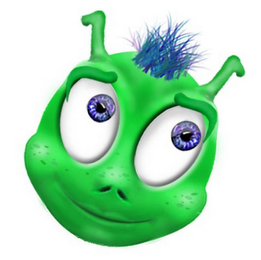 The mark consists of a stylized image of the head of a cartoon character with antenna with green skin, eyes in white, purple, black and grey, dark green eyebrows, black nostrils and a purple and blue tuft of hair.